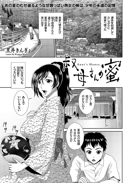 今すぐアダルトコミックを見る!旦那と喧嘩して実家に戻っていた叔母・桜子の艶やかな浴衣姿に「女」を意識し始めた少年・ひろしが体験する、あるひと夏の忘れがたき出来事…。手こずっていた夏休みの宿題を片づけ、先刻ふらりと屋敷から出て行った桜子を探しに出かけたひろしが目の当たりにしたのは、野外の木々の間で桜子がひろしの兄たちにその熟肉を弄ばれる姿だった。衝撃と名状しがたい興奮のあまり呆然と佇むひろしの前に、不意に艶やかな微笑をたたえた桜子が現れて…。《夏の郷愁》がまぶしい抒情淫作。