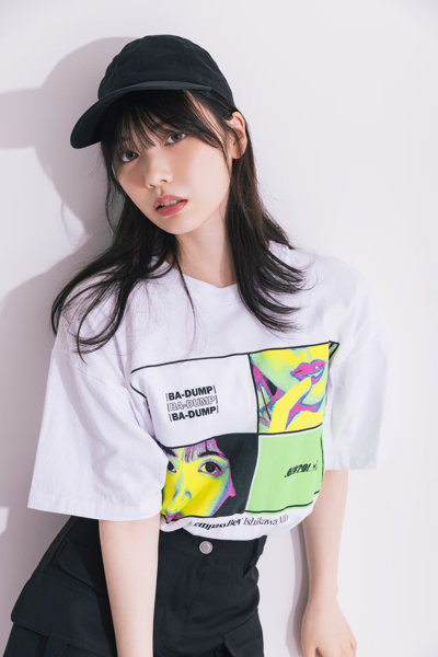 フロントに、’ドキドキ’を意味する「BA-DUMP」をネオンカラーで表現したグラフィックを大胆にプリント。口元に手をあてた艶やかな表情の石川さんにも注目です。