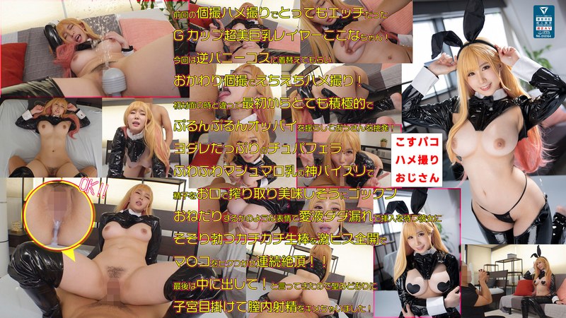 今すぐコスプレ動画を見る!▶前回の個撮ハメ撮りでとってもエッチだったGカップ超美巨乳レイヤーここなちゃん!たった1回でバイバイなんてもったいない!!今回は逆バニーコスに着替えてもらいおかわり個撮でえちえちハメ撮り!初対面の時と違って最初からとても積極的でぷるんぷるんオッパイを揺らしておっさんを挑発!ヨダレたっぷりのチュパフェラ、ふわふわマシュマロ乳の神パイズリし精子をお口で搾り取り美味しそうにゴックンして喉を潤すほどのドスケベさに変貌!1回発射した程度じゃ俺の息子は抑えられません!おねだりするかのような表情で愛液ダダ漏れで挿入を待つ彼女にそそり勃つカチカチ生棒を激ピス全開でお見舞いするとマ〇コをヒクつかせ連続絶頂!!最後は中に出して!と言ってきたので望みどおりに子宮目掛けて膣内射精をキメちゃいました!